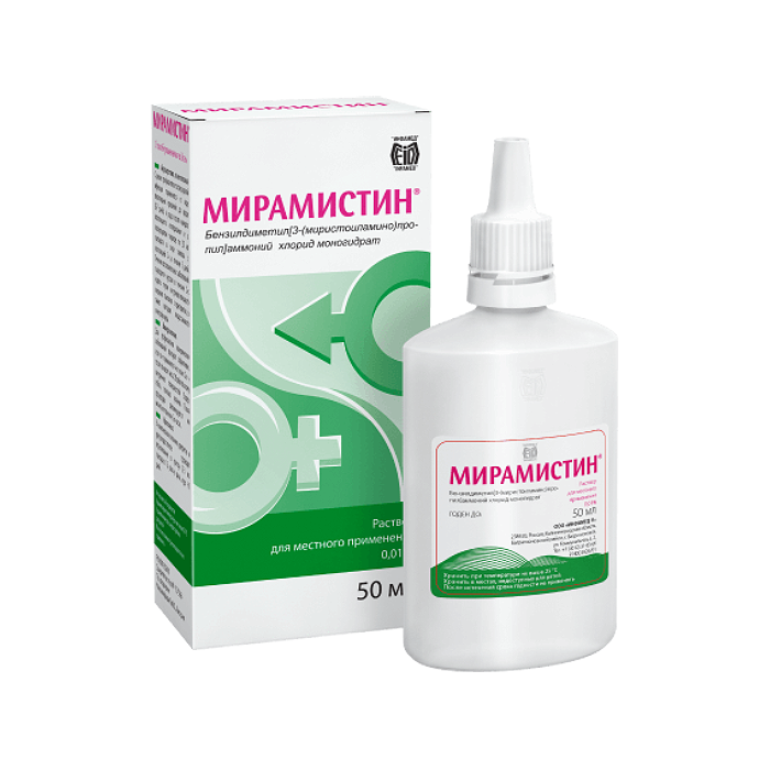 Мирамистин обладает широким спектром антимикробного действия, включая госпитальные штаммы, резистентные к антибиотикам. Препарат оказывает выраженное бактерицидное действие в отношении грамположительных (Staphylococcus spp., Streptococcus spp., Streptococcus pneumoniae) и грамотрицательных (Pseudomonas aeruginosa, Escherichia coli, Klebsiella spp.), аэробных и анаэробных бактерий, определяемых в виде монокультур и микробных ассоциаций, включая госпитальные штаммы с полирезистентностью к антибиотикам. Оказывает противогрибковое действие на аскомицеты рода Aspergillus и рода Penicillium, дрожжевые (Rhodotorula rubra, Torulopsis glabrata) и дрожжеподобные грибы (Candida albicans, Candida tropicalis, Candida krusei, Pityrosporum orbiculare (Malassezia furfur), дерматофиты (Trichophyton rubrum, Trichophyton mentagrophytes, Trichophyton verrucosum, Trichophyton schoenleini, Trichophyton violacent, Epidermophyton Kaufman-Wolf, Epidermophyton floccosum, Microsporum gypseum, Microsporum canis) в виде монокультур и микробных ассоциаций, включая грибковую микрофлору с резистентностью к химиотерапевтическим препаратам. Обладает противовирусным действием, активен в отношении сложноустроенных вирусов (вирусы герпеса, вирус иммунодефицита человека). Мирамистин® действует на возбудителей заболеваний, передающихся половым путем (Chlamydia spp., Treponema spp., Trichomonas vaginalis, Neisseria gonorrhoeae). Эффективно предотвращает инфицирование ран и ожогов. Активизирует процессы регенерации. Стимулирует защитные реакции в месте применения, за счет активации поглотительной и переваривающей функции фагоцитов потенцирует активность моноцитарно-макрофагальной системы. Обладает выраженной гиперосмолярной активностью, вследствие чего купирует раневое и перифокальное воспаление, абсорбирует гнойный экссудат, способствуя формированию сухого струпа. Не повреждает грануляции и жизнеспособные клетки кожи, не угнетает краевую эпителизацию. Не обладает местно-раздражающим действием и аллергизирующими свойствами.