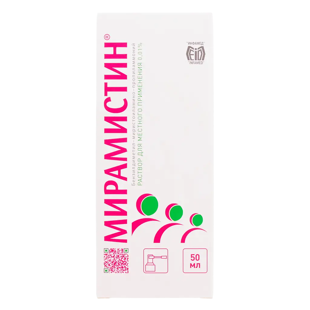 Мирамистин обладает широким спектром антимикробного действия, включая госпитальные штаммы, резистентные к антибиотикам. Препарат оказывает выраженное бактерицидное действие в отношении грамположительных (Staphylococcus spp., Streptococcus spp., Streptococcus pneumoniae) и грамотрицательных (Pseudomonas aeruginosa, Escherichia coli, Klebsiella spp.), аэробных и анаэробных бактерий, определяемых в виде монокультур и микробных ассоциаций, включая госпитальные штаммы с полирезистентностью к антибиотикам. Оказывает противогрибковое действие на аскомицеты рода Aspergillus и рода Penicillium, дрожжевые (Rhodotorula rubra, Torulopsis glabrata) и дрожжеподобные грибы (Candida albicans, Candida tropicalis, Candida krusei, Pityrosporum orbiculare (Malassezia furfur), дерматофиты (Trichophyton rubrum, Trichophyton mentagrophytes, Trichophyton verrucosum, Trichophyton schoenleini, Trichophyton violacent, Epidermophyton Kaufman-Wolf, Epidermophyton floccosum, Microsporum gypseum, Microsporum canis) в виде монокультур и микробных ассоциаций, включая грибковую микрофлору с резистентностью к химиотерапевтическим препаратам. Обладает противовирусным действием, активен в отношении сложноустроенных вирусов (вирусы герпеса, вирус иммунодефицита человека). Мирамистин® действует на возбудителей заболеваний, передающихся половым путем (Chlamydia spp., Treponema spp., Trichomonas vaginalis, Neisseria gonorrhoeae). Эффективно предотвращает инфицирование ран и ожогов. Активизирует процессы регенерации. Стимулирует защитные реакции в месте применения, за счет активации поглотительной и переваривающей функции фагоцитов потенцирует активность моноцитарно-макрофагальной системы. Обладает выраженной гиперосмолярной активностью, вследствие чего купирует раневое и перифокальное воспаление, абсорбирует гнойный экссудат, способствуя формированию сухого струпа. Не повреждает грануляции и жизнеспособные клетки кожи, не угнетает краевую эпителизацию. Не обладает местно-раздражающим действием и аллергизирующими свойствами.