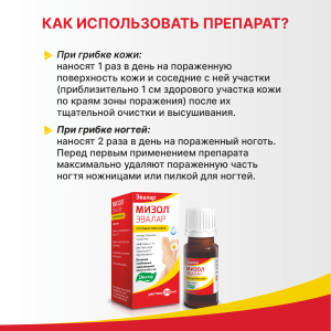 Мизол® Эвалар эффективен при лечении микозов, поражающих области кожи с гиперкератозом, а также в зонах роста волос.