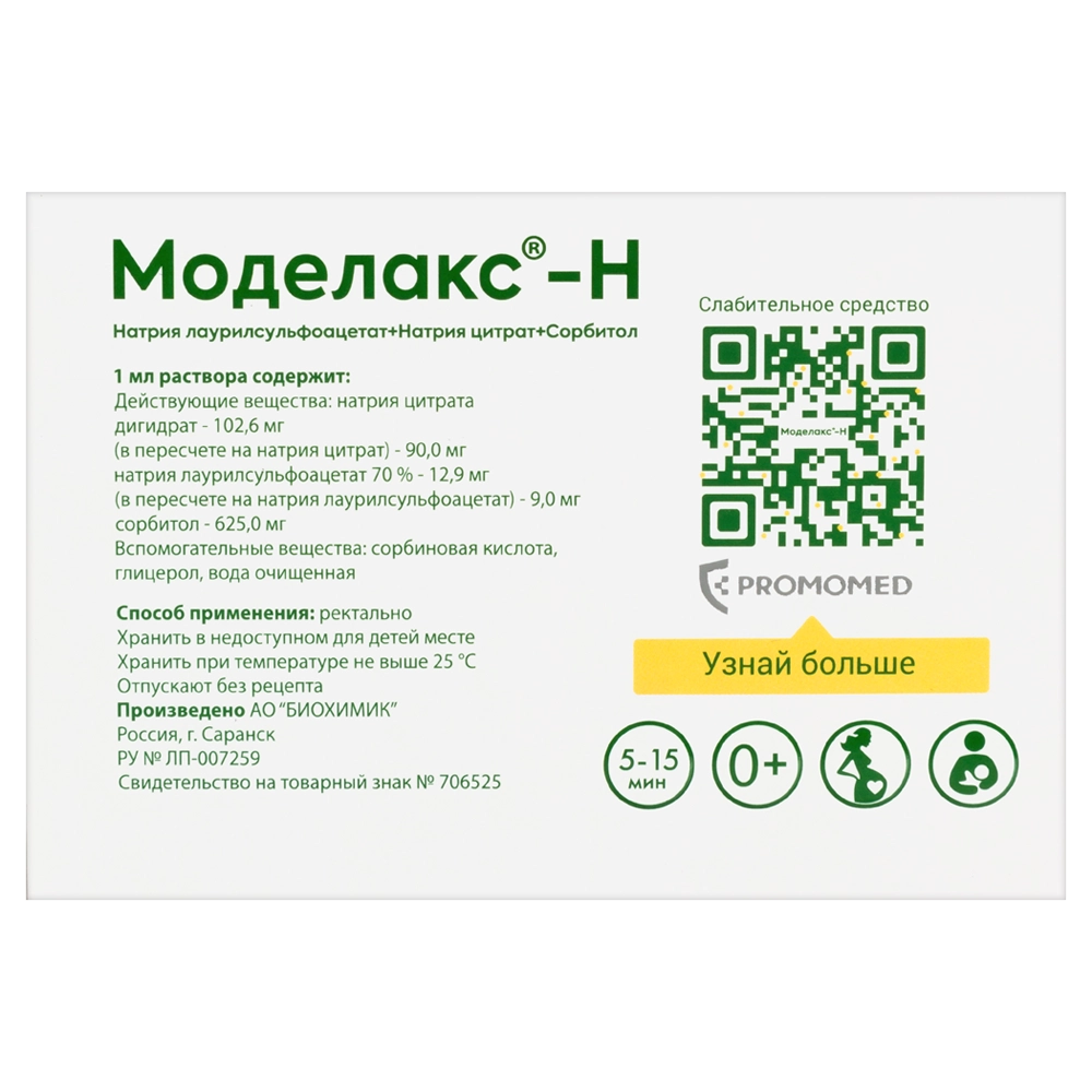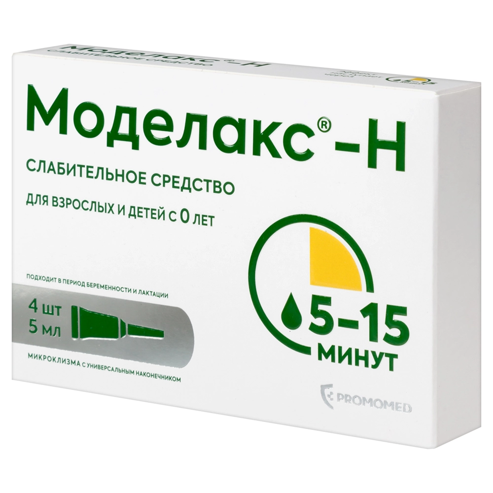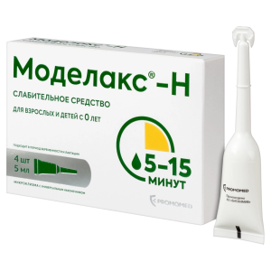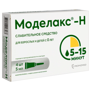 Моделакс®-Н — комбинированный препарат, оказывающий слабительное действие. Эффект наступает через 5–15 минут. В состав препарата входят натрия цитрат (пептизатор, который вытесняет связанную воду, содержащуюся в каловых массах), натрия лаурилсульфоацетат (разжижает содержимое кишечника) и сорбит (усиливает слабительное действие путём стимуляции поступления воды в кишечник). Увеличение количества воды за счёт пептизации и разжижения способствует размягчению каловых масс и облегчает опорожнение кишечника.