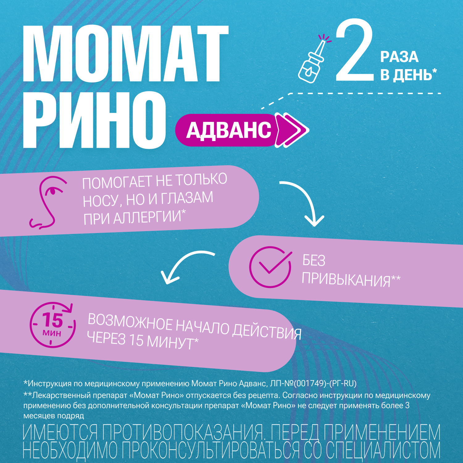 Препарат Момат Рино Адванс содержит бензалкония хлорид, который может вызывать раздражение слизистой оболочки полости носа и бронхоспазм.