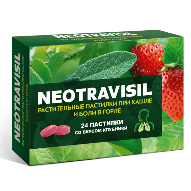 Растительное средство NEOTRAVISIL содержит инновационную комбинацию из 4 экстрактов лекарственных трав: солодки, эвкалипта, камфоры, мяты, а также экстракт плодов апельсина, которые, благодаря комплексному эффекту компонентов, обеспечивают двойное действие: помогают при кашле и боли в горле.