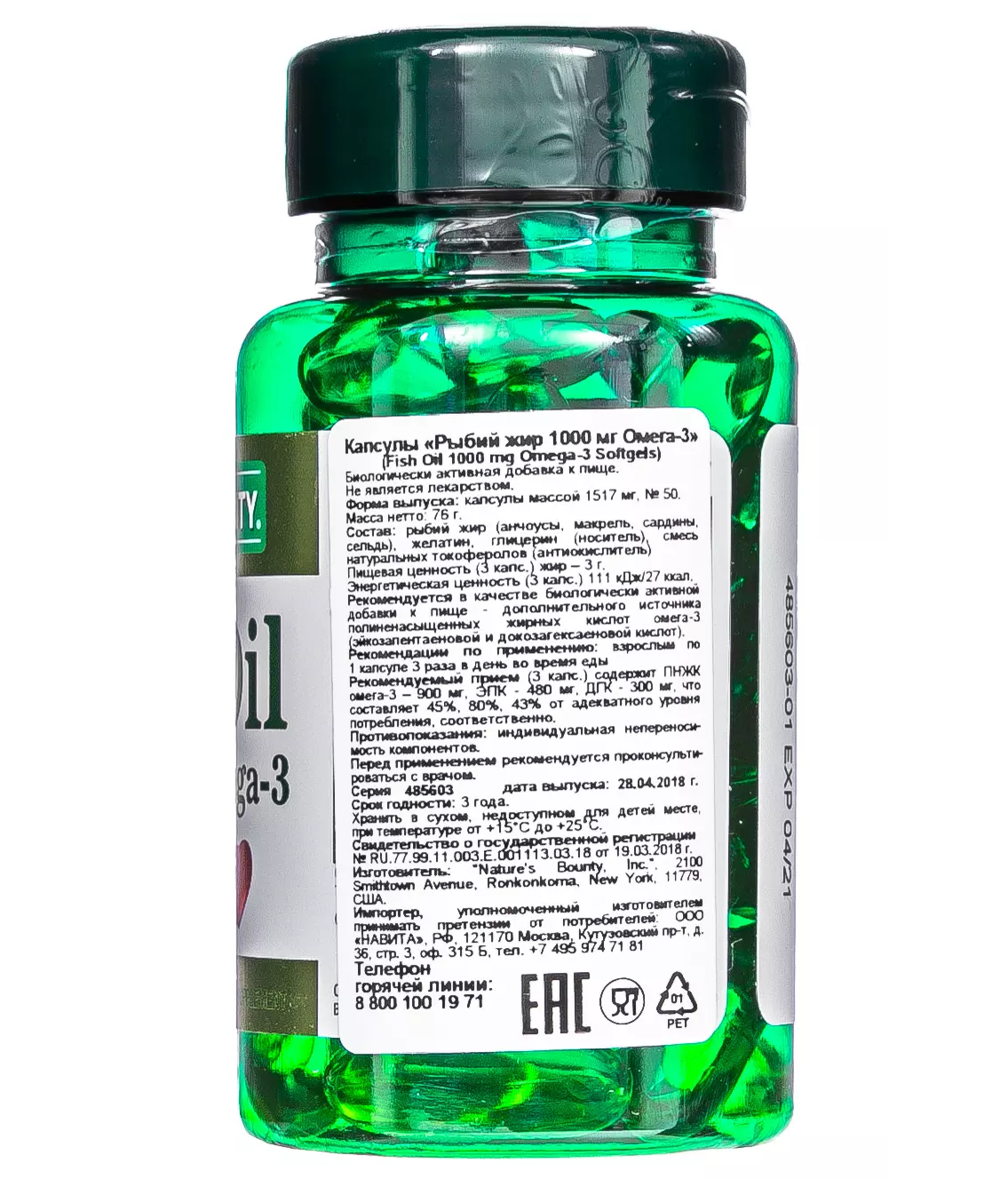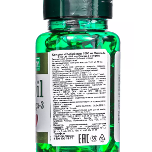 Капсулы «Рыбий жир 1000 мг Омега-3» («Fish Oil 1000 mg Omega-3 Softgels»). Рыбий жир - натуральный источник незаменимых омега-3 полиненасыщенных жирных кислот (ПНЖК).