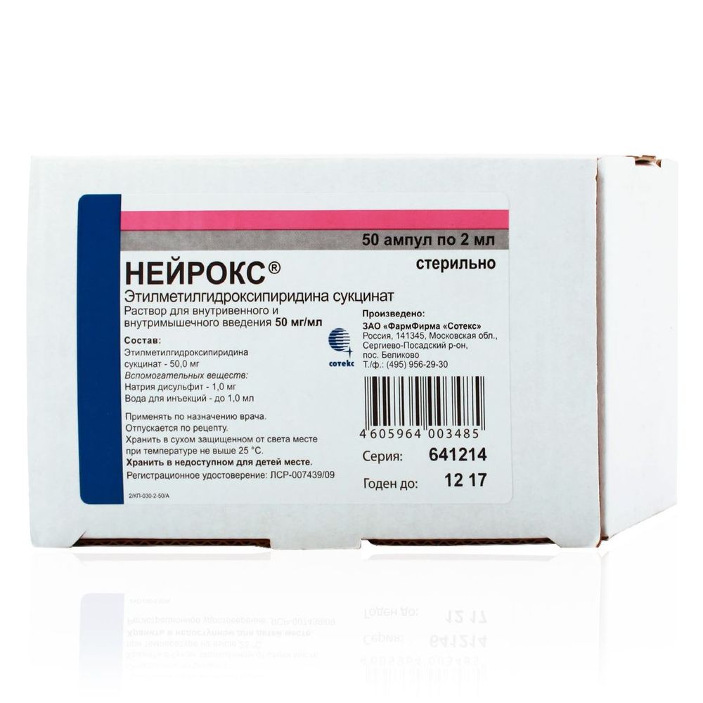 1 ампула (10 мл) содержит в качестве активного вещества этилметилгидроксипиридина сукцинат — 500 мг