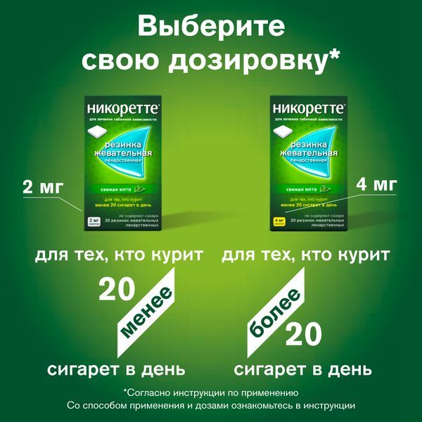- жевательной резинкой «Никоретте® » 4 мг (повышенное содержание никотина) следует пользоваться, если Вы выкуриваете более 20 сигарет в день или Вам не удалось бросить курить при использовании жевательной резинки в дозе 2 мг.