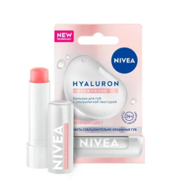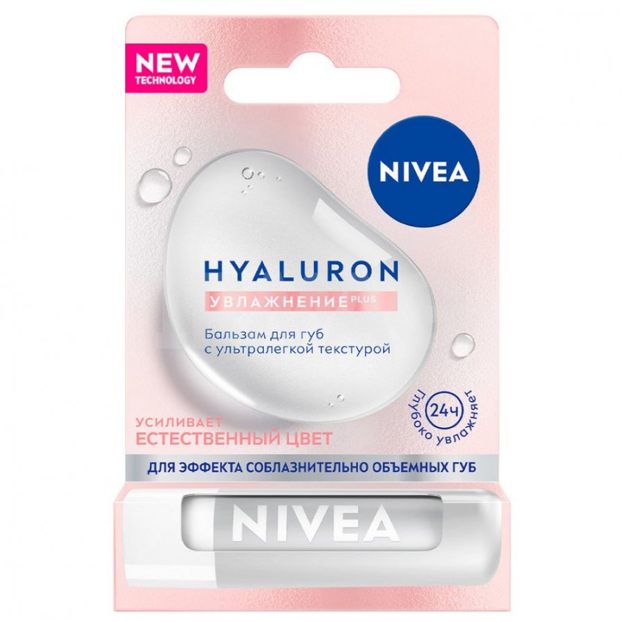 Попробуйте новинку - бальзам для губ с ультралегкой текстурой HYALURON Увлажнение PLUS от NIVEA с гиалуроновой кислотой и ментолом. Обогащённая Гиалуроновой кислотой* и ментолом обволакивающая текстура бальзама наполняет губы влагой, подчеркивает естественный нежно-розовый цвет и придает соблазнительный объем с эффектом увеличенных губ. Мгновенно тая, бальзам дарит губам свежий, цветочно-фруктовый аромат, ухаживает и восстанавливает кожу, увлажняет 24 часа,** не оставляя ощущения липкости.