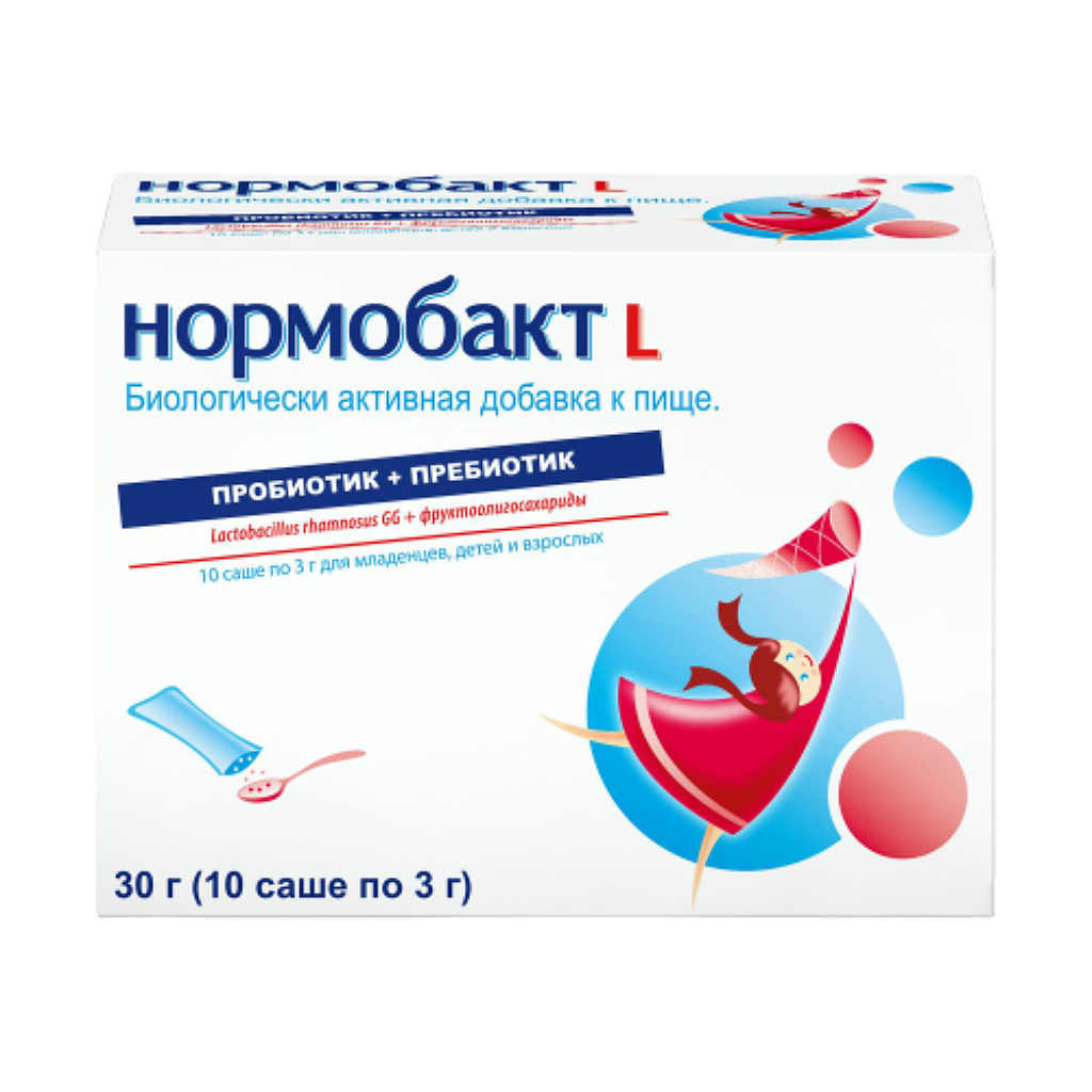Нормобакт L – это сочетание пробиотиков (живые молочнокислые бактерии LactobacillusrhamnosusGG) и пребиотиков (фруктоолигосахариды), которое продлевает период жизни «полезных» бактерий и значительно увеличивает их количество в кишечнике. восстанавливает иммунную устойчивость организма.