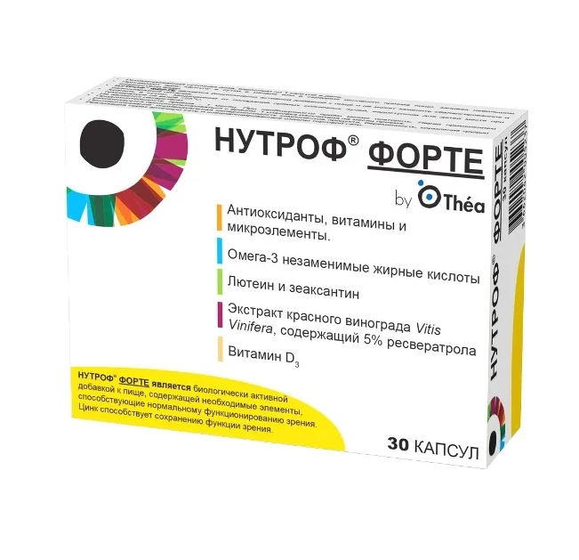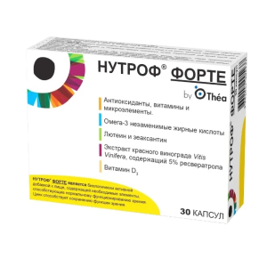 НУТРОФ- ФОРТЕ является биологически активной добавкой к пище, содержащей витамины с антиоксидантными свойствами и микроэлементы, лютеин, зеаксантин, омега-3 незаменимые жирные кислоты, экстракт винограда Vitis Vinifera, содержащий 5 % ресвератрола, витамин D3.