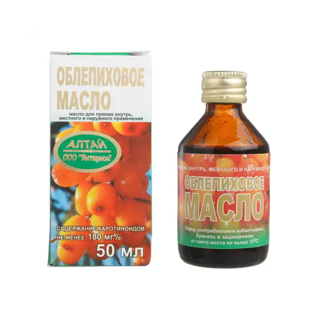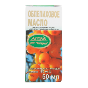 Действующее вещество — облепихового масла концентрат с содержанием суммы каротиноидов 300 мг % (в пересчёте на бетакаротен) — 60 г.