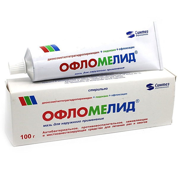 Офломелид® — комбинированный препарат, оказывает противомикробное, противовоспалительное, местноанестезирующее, регенерирующее действие. Активными веществами являются офлоксацин, метилурацил и лидокаин.