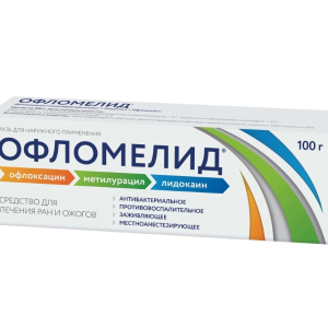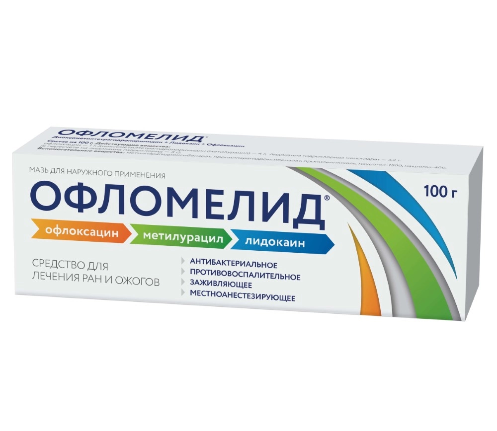 Офломелид® — комбинированный препарат, оказывает противомикробное, противовоспалительное, местноанестезирующее, регенерирующее действие. Активными веществами являются офлоксацин, метилурацил и лидокаин.