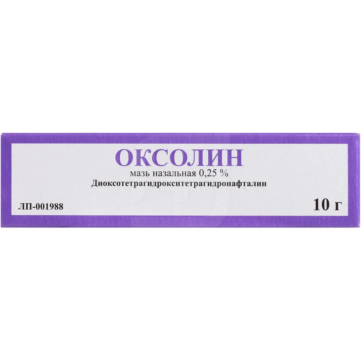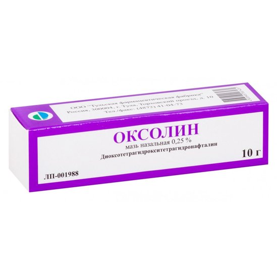 Действующее вещество: диоксотетрагидрокситетрагидронафталин (оксолин) — 0,25 г.