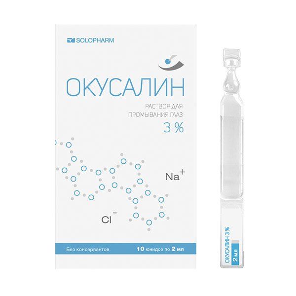 Раствор для промывания глаз Окусалин 3 % (далее – раствор) представляет собой прозрачную бесцветную жидкость без запаха.