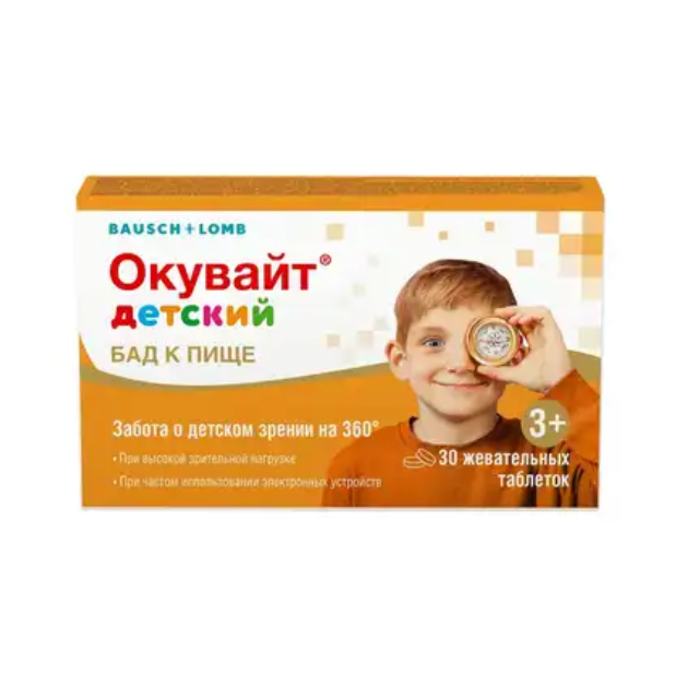 Более 90 % информации об окружающем мире ребенок получает через органы зрения и это особенно важно для дальнейшего развития личности. Хорошее зрение способствует гармоничному формированию интеллекта, мировоззрения и уверенности в себе. В связи с этим болезни глаз у детей — это не только медицинская проблема. Необходимость усваивать большие объемы информации способствует значительному увеличению нагрузки на органы зрения, начиная с детского возраста. По итогам всероссийской диспансеризации в 2017-2018 годах было отмечено, что распространенность миопии среди учеников 1-х классов составила 2,4 %, среди учеников 5-х классов — 19,7 %, среди выпускников школ — 38,6 %. Одной из причин роста числа детей с данной проблемой офтальмологи считают активное использование компьютеров. Исследования показали, что рассматривание информации на достаточно близком расстоянии со светящегося экрана более утомительно, чем чтение книг или просмотр телепередач. После традиционных занятий зрительное утомление регистрировалось у 8,6 % учащихся, тогда как после занятий с компьютером — у 38,3 %. Очень важно обеспечить детей надежным комплексом мероприятий при повышенной нагрузке и стрессах, к которым относится правильное освещение рабочего места, дозированная нагрузка на глаза, регулярное выполнение упражнений для глаз и прием витаминов и микроэлементов, которые нужны для поддержания здорового зрения. Проведенные Институтом питания РАМН популяционные исследования показали недостаточное потребление витаминов (С, Е, группы В), микроэлементов (железа, цинка, йода, селена) значительной частью населения Российской Федерации, причем статистика среди школьников свидетельствует о получении ими лишь 50 % от необходимого количества витамина С, 31–36 % витаминов группы В, 21 % витамина Е. Витамины (С, Е, группы В) и микроэлементы (цинк, селен и другие) должны поступать с пищей или с биологически активными добавками к пище в случае несбалансированной диеты. «Окувайт детский» — поликомпонентный продукт, содержащий лютеин, зеаксантин, антоцианы из экстракта плодов черники (Vaccinium myrtillus), таурин, витамины группы В (В1, В3/РР, В5, В6, В9, В12), витамины D3, С, Е и цинк, селен. Все входящие в состав БАД к пище «Окувайт детский» компоненты обеспечивают защиту зрительного аппарата, обладают антиоксидантным эффектом и снижают риск заболеваний глаз у детей.