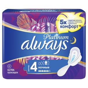 Always Platinum более комфортны (по сравнению с Always Ultra) благодаря тысячам микроподушечек и новым, мягким как шелк крылышкам. Они также обеспечивают лучшую защиту (по сравнению с Always Ultra) благодаря защитным боковым барьерам и ультравпитывающему внутреннему слою, который запирает влагу внутри. Always Platinum Ночные (Размер 4) с крылышками рекомендованы для ночного использования или для дневного использования при обильных выделениях.