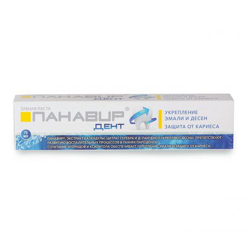 - Комплекс активных компонентов зубной пасты «ПАНАВИР® дент» обеспечивает антимикробное, противовоспалительное, местное противовирусное и заживляющее действие, помогает сохранить здоровье зубов и десен.