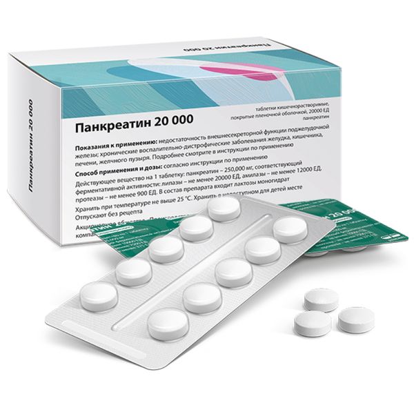 При остром панкреатите или обострении хронического панкреатита (на стадии затухания обострения), в период восстановительного диетического питания, целесообразно принимать препарат Панкреатин 20 000 на фоне имеющей место и/или остающейся в дальнейшем экзокринной недостаточности поджелудочной железы.