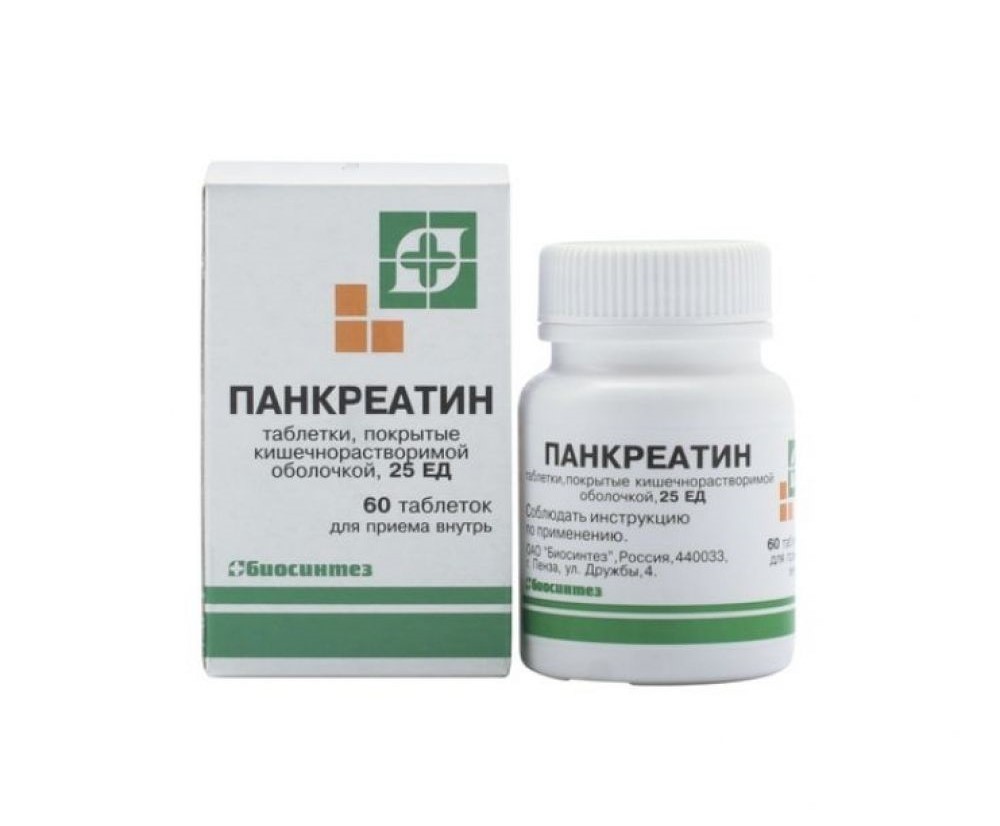 1 таблетка содержит панкреатина — 0,1 г (25 ЕД)