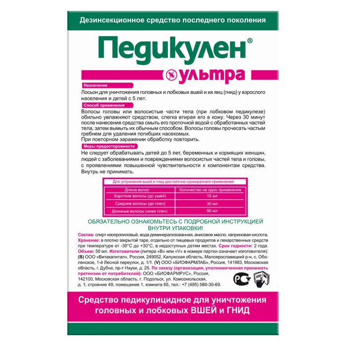 Педикулен ультра – дезинсекционное средство, уничтожает вшей и гнид за одно применение.