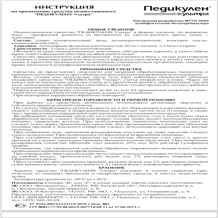 Лосьон для уничтожения головных и лобковых вшей и их яиц (гнид) у взрослого населения и детей с 5 лет.