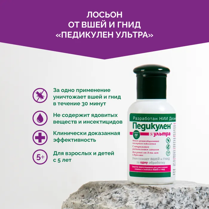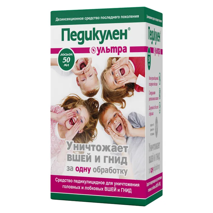 Лосьон ПЕДИКУЛЕН УЛЬТРА – это надежное средство для борьбы с вшами и гнидами! Средство эффективно как для взрослых, так и для детей от 5 лет. Благодаря уникальной формуле лосьона, вы получите быстрый и надежный результат уже через 30 минут после нанесения. Средство от вшей на голове обеспечивает 100% гибель вшей и гнид, обладая клинически доказанной эффективностью. Специально разработанный режим применения с учетом всех особенностей борьбы с паразитами гарантирует полное избавление от них. Состав лосьона безопасен для кожи и волос. Простое нанесение, экспозиция и смывание – и вы снова наслаждаетесь здоровой, чистой кожей без вшей и гнид. Не теряйте времени на бесполезные попытки борьбы с неприятными паразитами – выберите лосьон от вшей для детей и взрослых ПЕДИКУЛЕН УЛЬТРА и позаботьтесь о своем здоровье и комфорте. Уверены, что это лучший выбор для вашей семьи!