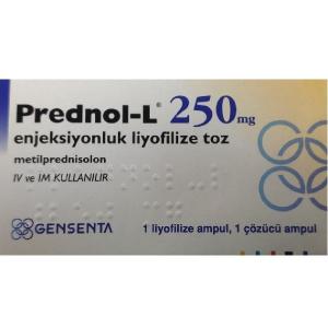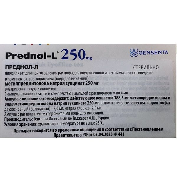 Преднол-Л лиофилизат для приготовления раствора для внутривенного и внутримышечного введения 250мг ампула №1 в комплекте с растворителем вода для инъекций ампула 4мл №1