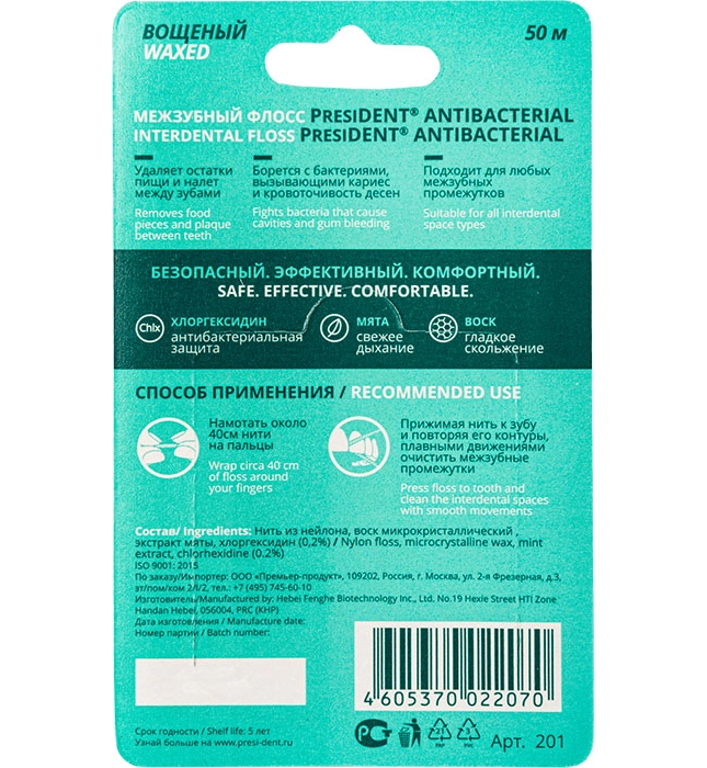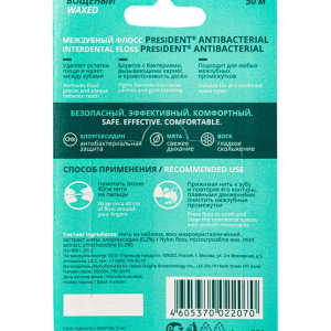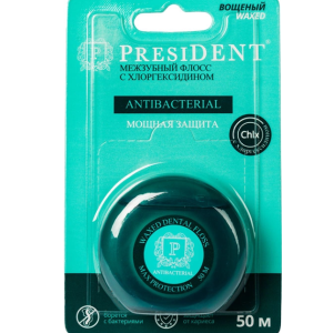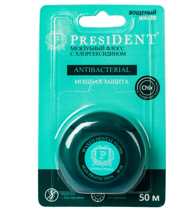 Межзубный флосс (вощеный) с хлоргексидином PRESIDENT Antibacterial удаляет остатки пищи и налет между зубами, борется с бактериями, вызывающими кариес и кровоточивость десен, подходит для любых межзубных промежутков.