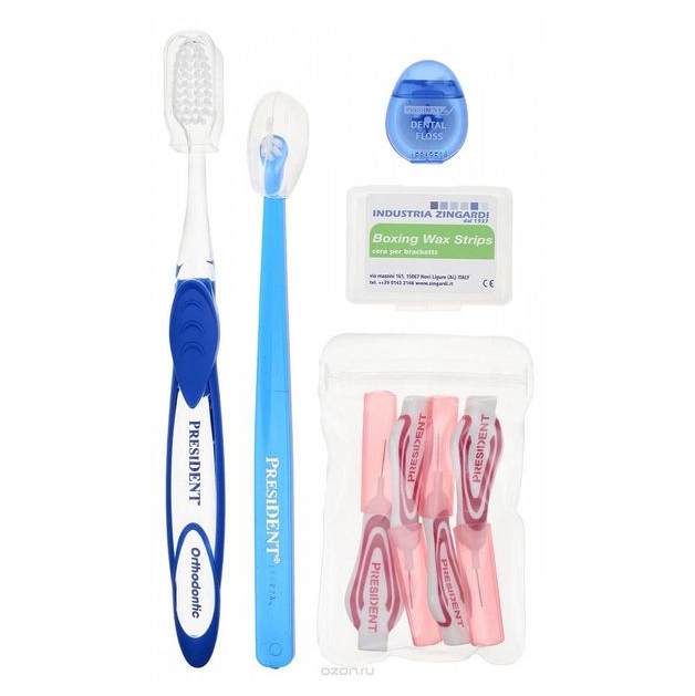 В наборе: 1) зубная щетка ортодонтическая с V-образным профилем щетины 2) малопучковая зубная щетка для чистки ортодонтических конструкций и мест их фиксации 3) ершики для чистки труднодоступных участков брекет-систем 4) межзубный флосс: фитофлосс «PresiDENT Classic» с мятой 5) «воск в полосках» для уменьшения трения дуги в пазах брекетов.