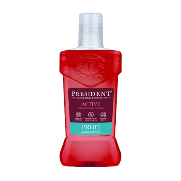 Ополаскиватель PRESIDENT PROFI Active укрепляет рыхлые десны, подавляет рост болезнетворных бактерий. При разбавлении 1:5 может быть использован как жидкость для ирригатора. Проникает в самые труднодоступные участки. Является эффективным дополнением к зубным пастам President Profi Activeи President Profi Plus Extra Active. Не содержит спирта.