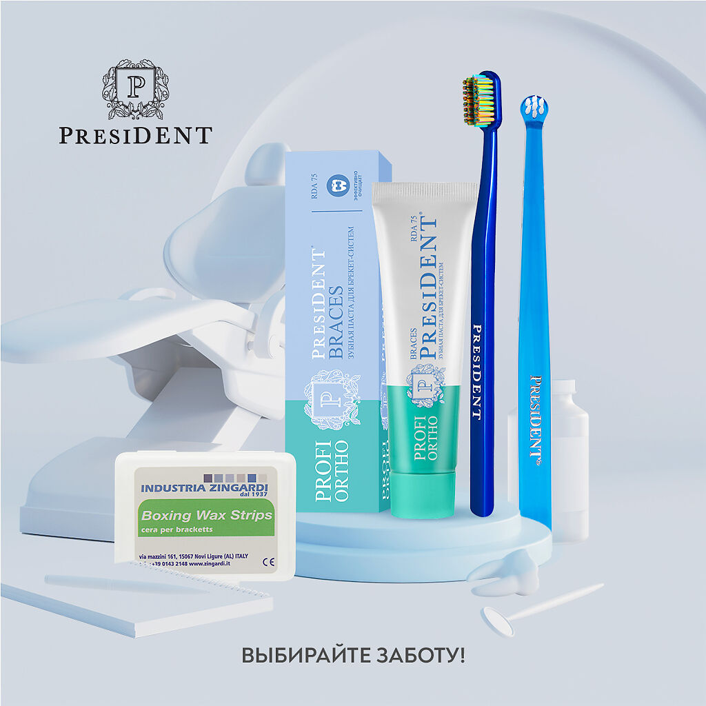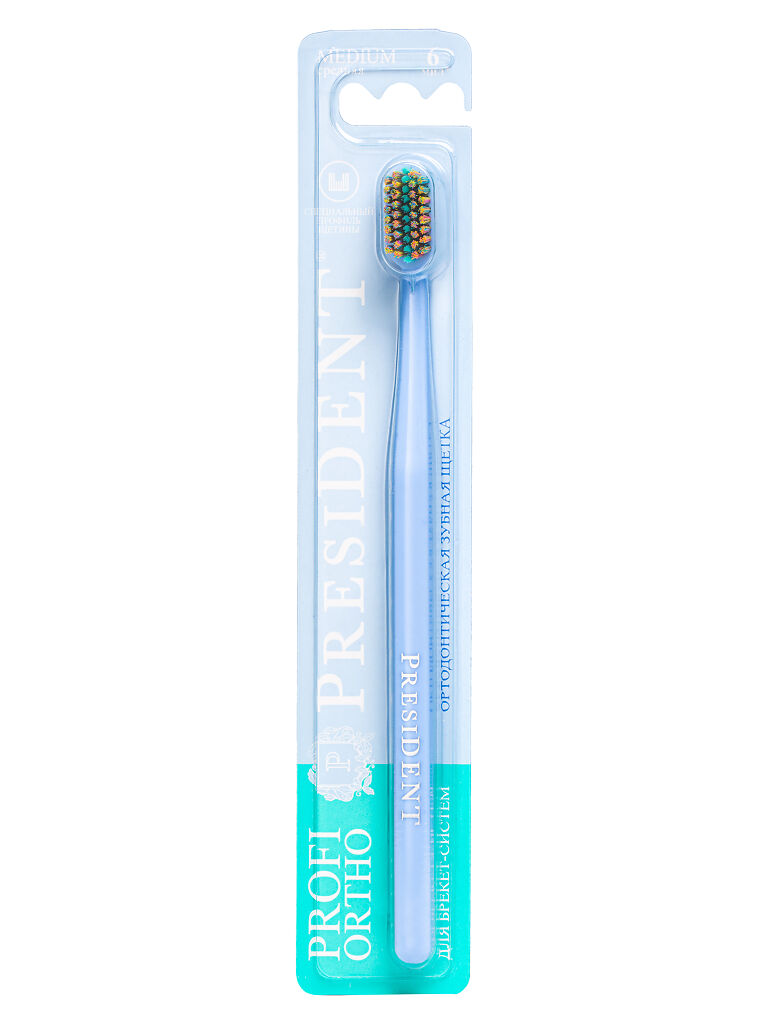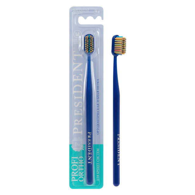 Зубная щётка PRESIDENT Profi Ortho со специальным профилем щетины предназначена для профессионального ухода за полостью рта в период использования брекет-систем.