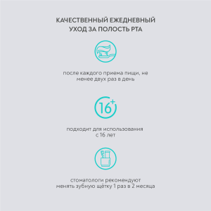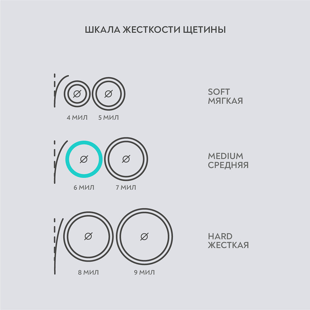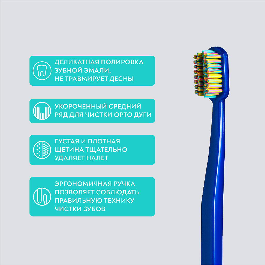 Компактная головка обеспечивает бережное очищение всех участков зубного ряда. Специально подобранная степень жесткости щетины (6 МИЛ) тщательно удаляет налет, в том числе с элементов конструкции брекет-системы.