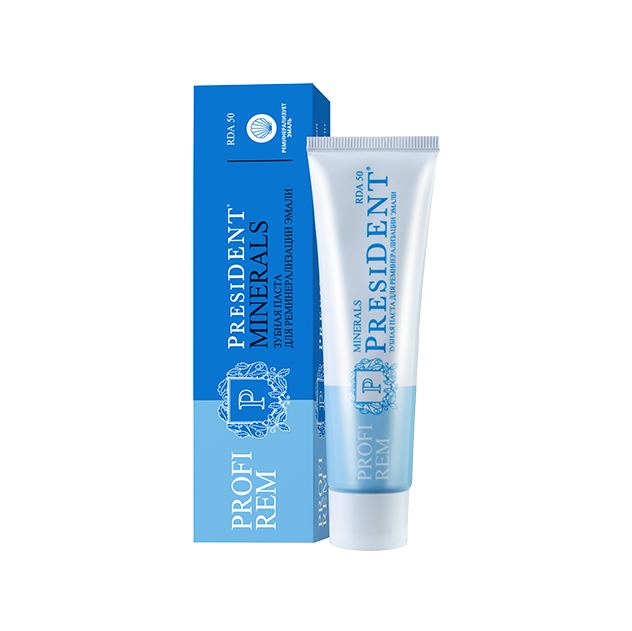 Зубная паста PRESIDENT PROFI REM Minerals RDA 50* реминерализует эмаль, бережно и эффективно очищает, способствует снижению чувствительности дентина и риска развития кариеса. 1 этап системы реминерализации PRESIDENT PROFI REM Minerals.