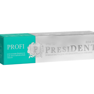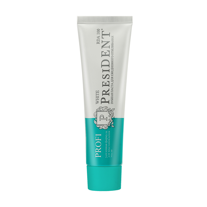 Зубная паста President White способствует реминерализации эмали наряду с отбеливанием. Бережно полирует эмаль, защищает от темного налета, нейтрализует запах табака. Подходит для ежедневного применения, не разрушает эмаль зубов. Не содержит пероксида водорода и карбамида, жестких абразивных компонентов, разрушающих ферментов. Не содержит агрессивных антибактериальных агентов.
