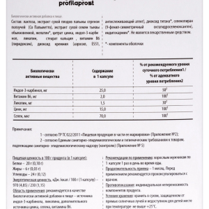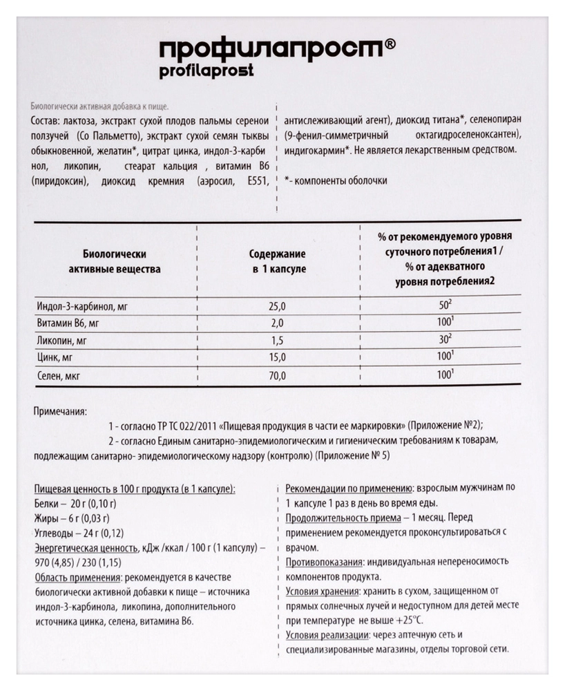Экстракт сухой плодов пальмы сереноя ползучей (Со Пальметто) - 100 мг Экстракт сухой семян тыквы обыкновенной - 80 мг Индол-3-карбинол - 25 мг Цинк - 15 мг Витамин В6 - 2 мг Ликопин - 1,5 мг Селен - 70 мкг.