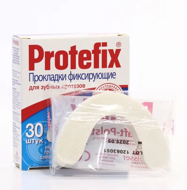 Фиксирующие прокладки Protefix® (Протефикс) для протезов нижней челюсти прежде всего рекомендуются врачом на этапе привыкания больного к протезу. Особенно эффективны прокладки при неблагоприятном строении челюсти, при возрастной деформации десен, а также при атрофии альвеолярного отростка челюсти.