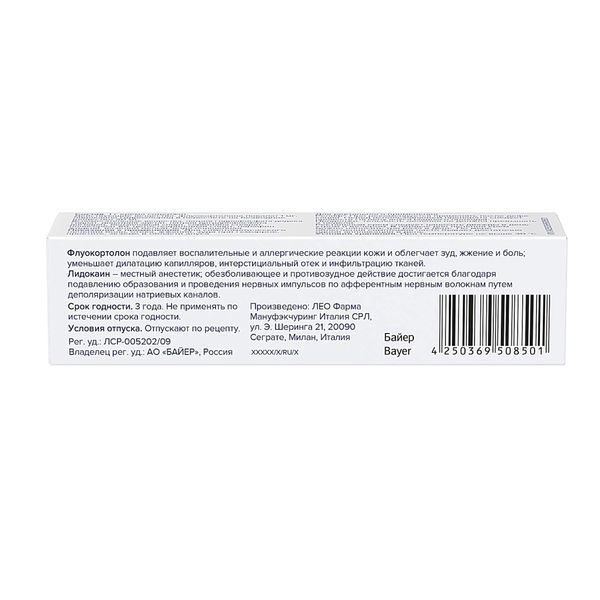 активные вещества: флуокортолона пивалат 1 мг, лидокаина гидрохлорид в пересчёте на безводное вещество 20 мг