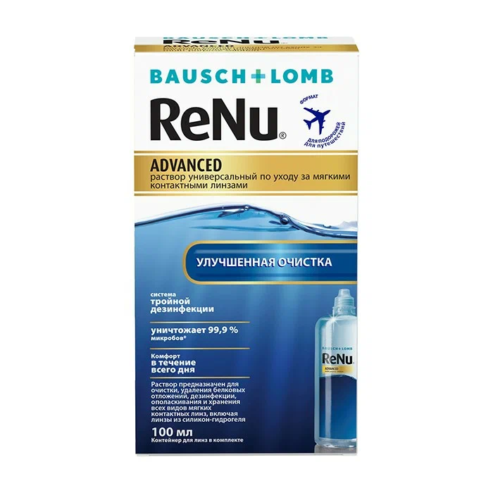 Универсальный раствор ReNu® Advanced содержит в своём составе уникальное тройное дезинфицирующее средство. Универсальный раствор ReNu® Advanced восстанавливает линзы.