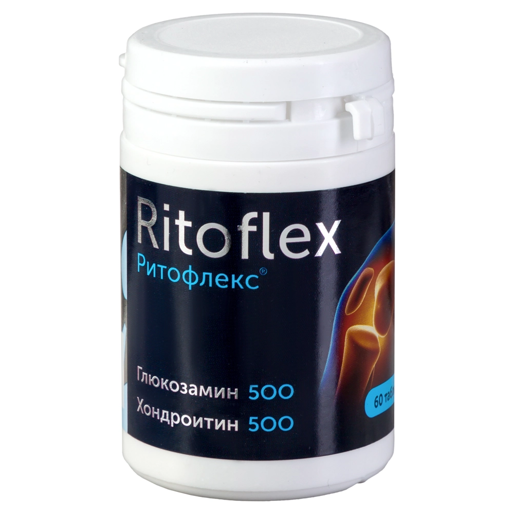 ГЛЮКОЗАМИН500+ХОНДРОИТИН500 РИТОФЛЕКС - Биологически активная добавка (БАД) к пище. Внешний вид и свойства: таблетки цилиндрической формы. Цвет от белого до серого, возможны вкрапления. Могут оставлять белый след на руках, т.к. не покрыты химической оболочкой. Содержит комплекс активных компонентов, необходимых для естественного восстановления хрящевой ткани при проблемах с суставами. Хондроитин и глюкозамин стимулируют регенерацию хрящевой ткани, а также предупреждают и замедляют процессы резорбции костной ткани.