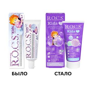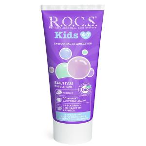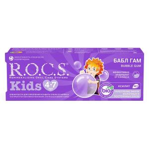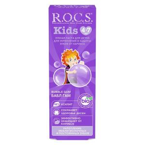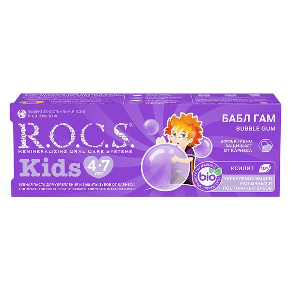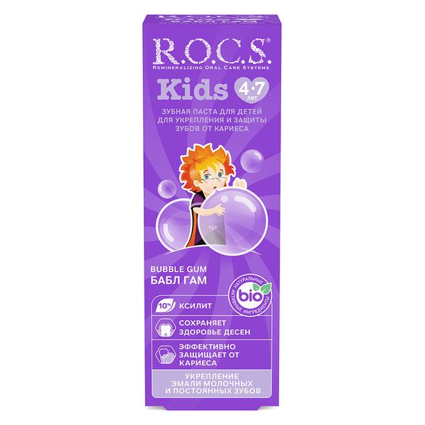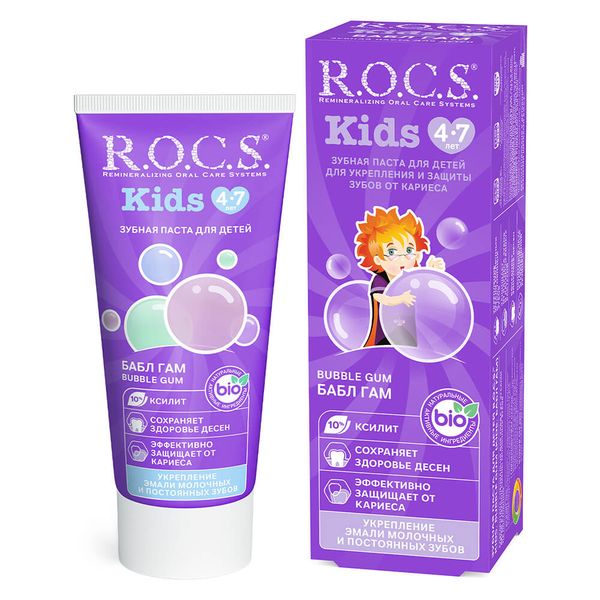 Зубная паста R.O.C.S. «Бабл Гам», для детей, 45 г - для детей от 4 до 7 лет, разработана при участии стоматологов с учётом возрастных особенностей ребёнка. Рекомендована детям, склонным к аллергии. Не содержит лаурилсульфат натрия.