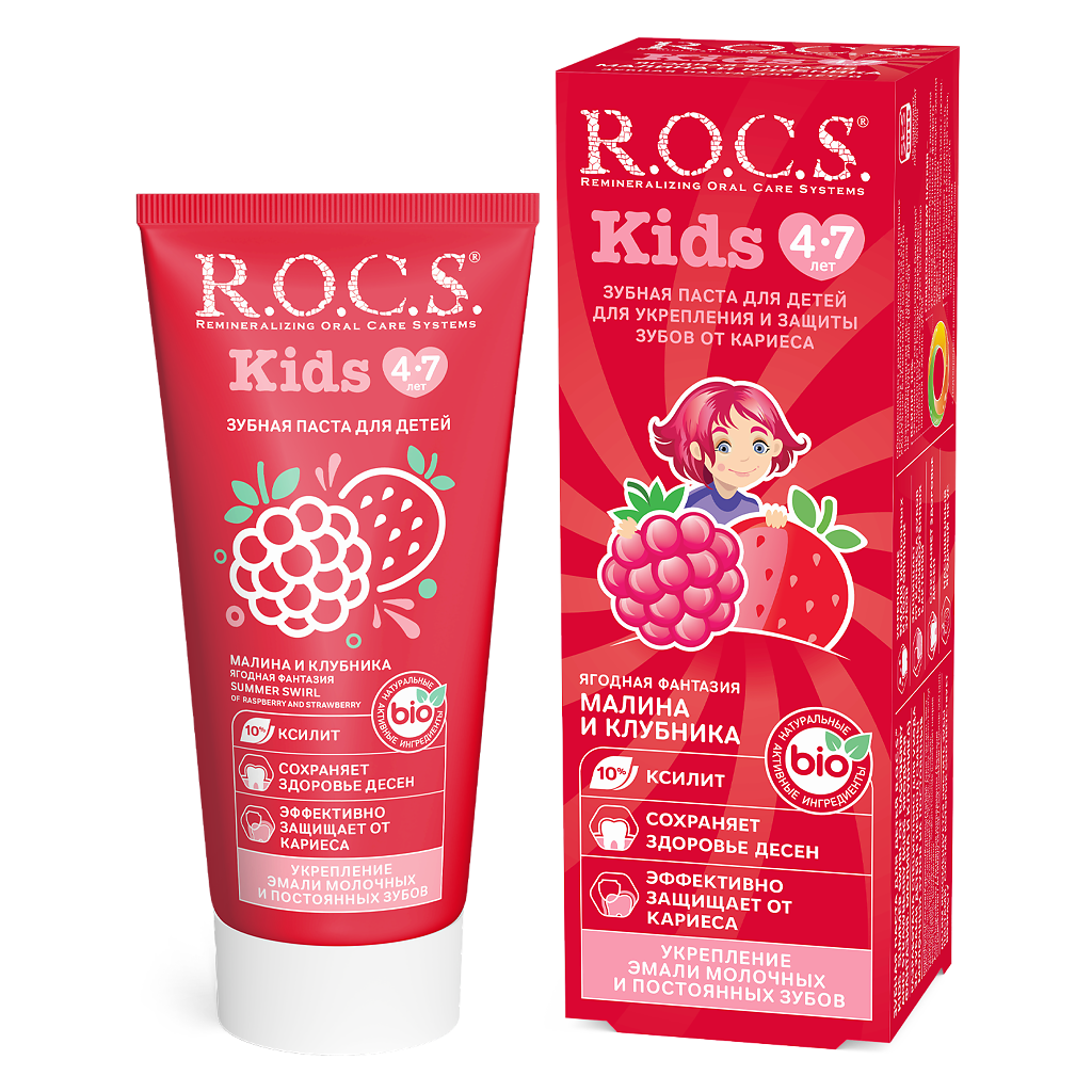 Зубная паста для детей от 4 до 7 лет R.O.C.S. Kids «Малина и Клубника» обеспечивает эффективную гигиену ротовой полости, защищает нежную эмаль от растворяющего действия кислот, предохраняет зубы от кариеса, обеспечивает бережный уход за деснами.