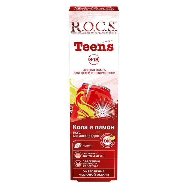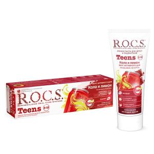 Новая зубная паста детская R. O. C. S. Teens. Вкус активного дня Кола и Лимон разработана специально для детей и подростков в возрасте от 8 до 18 лет. Сотрудникам научно-исследовательской лаборатории WDS совместно с практикующими стоматологами удалось создать уникальный продукт, сочетающий выраженное лечебно-профилактическое действие и необычный аромат напитка, столь любимого многими школьниками и молодежью. Запатентованная формула зубной пасты R. O. C. S. Teens содержит высокоэффективный комплекс AMIFLUOR и дополнительные компоненты, которые в совокупности обеспечивают противовоспалительное, пребиотическое действие, защищают от кариеса, кровоточивости десен и других стоматологических заболеваний, укрепляют эмаль, гарантируют качественную гигиену ротовой полости.