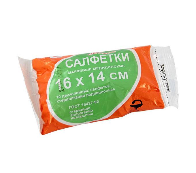 Салфетки марлевые 16х14 — готовые операционно-перевязочные медицинские двухслойные средства, прошедшие стерилизацию.