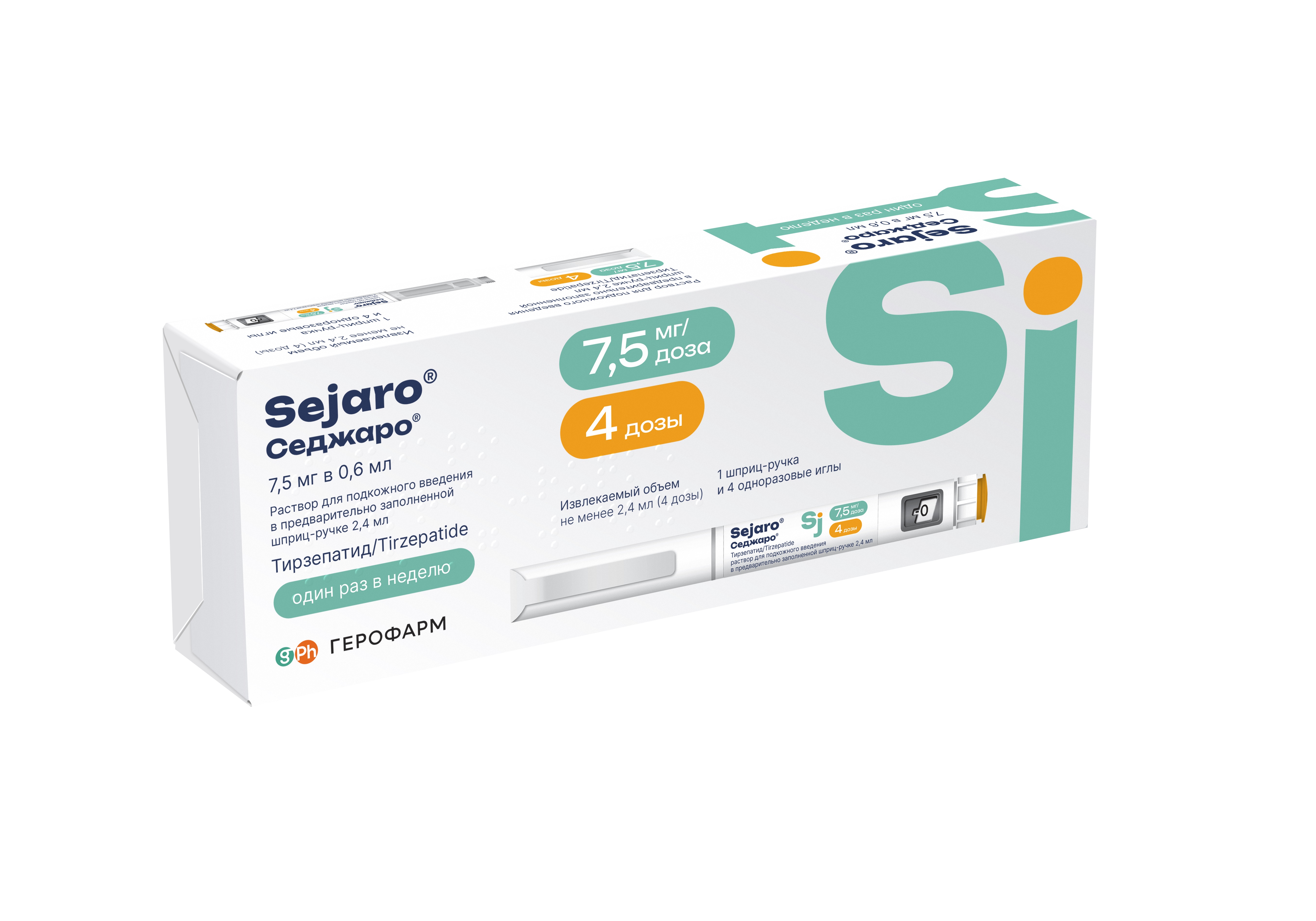 7,5 мг/доза — 7,5 мг в 0,6 мл, 30 мг тирзепатида в 2,4 мл раствора