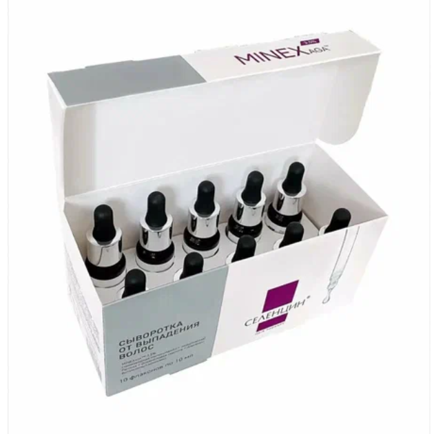 Сыворотка от выпадения волос Селенцин MINEXaga на основе производной минокcидила воздействует непосредственно на механизмы выпадения волос. Комплексное средство действует в трех направлениях – на кожу головы, корни и стержни волос, помогая эффективно бороться с выпадением, поредением и истончением волос. Воздействует на выпадение волос любой этиологии. Может использоваться как при диффузном, так и при андрогенетическом выпадении. Рекомендуется для мужчин и женщин. Без синдрома отмены.
