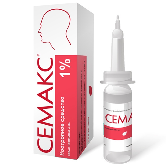 Семакс капли назальные 1 % — оригинальный синтетический пептидный препарат, являющийся аналогом фрагмента адренокортикотропного гормона (АКТГ4–10 ;) (метионил-глутамил-гистидил-фенилаланил-пролил-глицил-пролин), полностью лишенный гормональной активности. Все аминокислоты L-формы.
