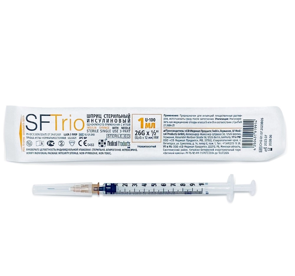 Шприц стерильный инсулиновый однократного применения объемом 1мл с иглой 26G x ½ (0.45 x 12 мм) SFTrio №1