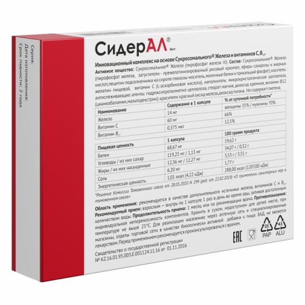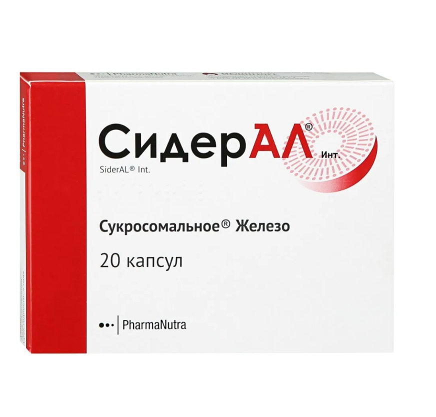 СидерАЛ® Инт (Sideral) – биологически активная добавка к пище, разработанная на основе сукросомального железа, который представляет собой инновационный легкоусвояемый источник железа в сукросомах (липосомах). Сукросомы – фосфолипидные микросферы, служащие для полноценного усвоения железа, которое всасывается напрямую из кишечника, не повреждая желудок и слизистую кишечника. Запатентованная сукросомальная технология позволяет избежать побочных эффектов, распространенных при приеме препаратов железа: изжоги, раздражения кишечника, расстройства стула (запор, понос), окрашивания слизистой оболочки ротовой полости и эмали зубов.