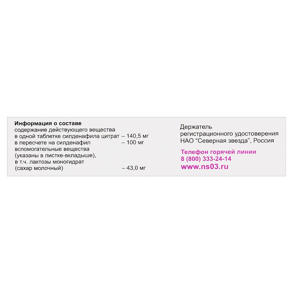 активное вещество: силденафила цитрат в пересчёте на силденафил — 100 мг вспомогательные вещества (ядро): целлюлоза микрокристаллическая — 83,5 мг лактозы моногидрат (сахар молочный) — 83,5 мг кроскармеллоза натрия (примеллоза) — 15,0 мг повидон (поливинилпирролидон среднемолекулярный) — 15,0 мг магния стеарат — 3,0 мг