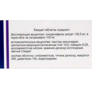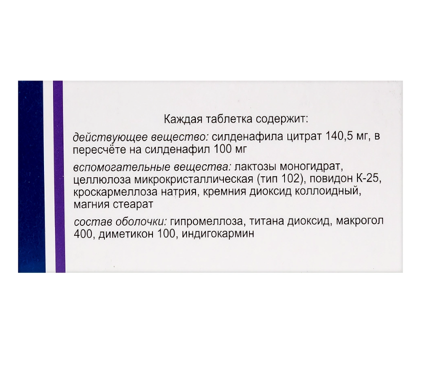 Каждая таблетка содержит 100 мг силденафила (в виде силденафила цитрата).