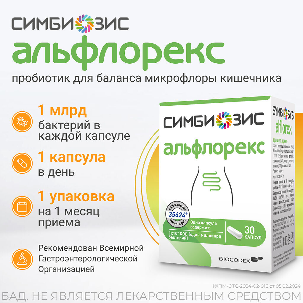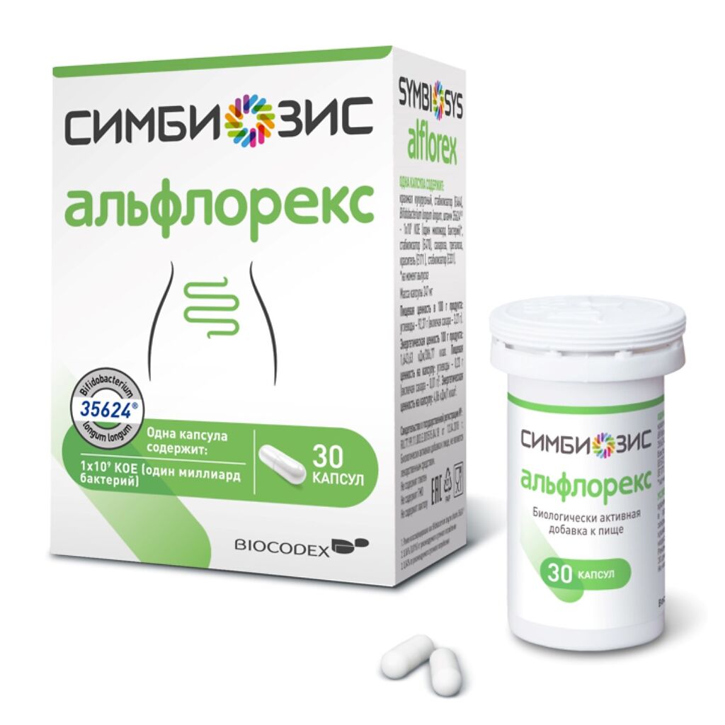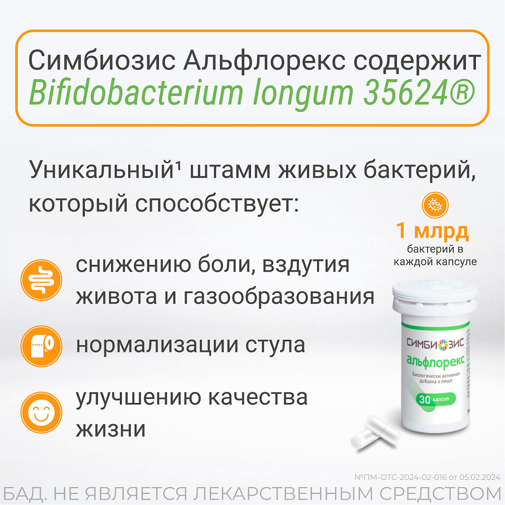Симбиозис Альфлорекс — это биологически активная добавка к пище, содержащая Bifidobacterium longum, штамм 35624®. В каждой капсуле Симбиозис Альфлорекс содержится 1 миллиард бактерий 1х109 КОЕ*.